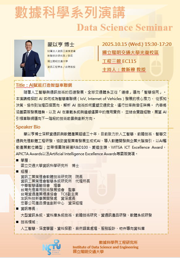 [數據科學系列演講] 2025.10.15 (Wed.) 15:30-17:20工程三館 EC115 講題: AI賦能打造智慧車聯網
