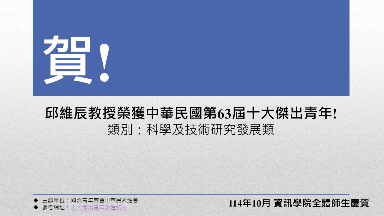【獲獎捷報】賀!邱維辰教授榮獲十大傑出青年! Published on 2025-10-16 14:50 Author 邱津雷 Tweet 參考網址:https://www.taiwanjc.org.tw/news/9000 十大傑出青年評選結果