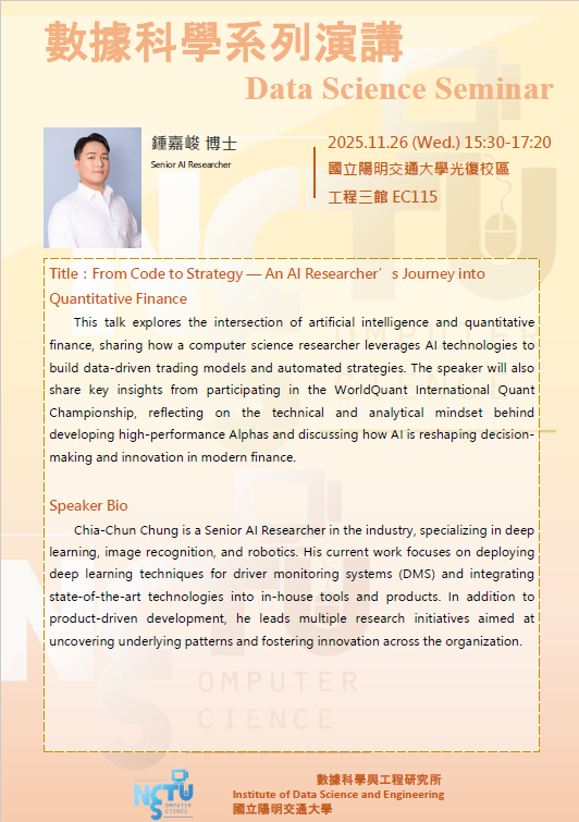 [數據科學系列演講] 2025.11.26 (Wed.) 15:30-17:20工程三館 EC115 講題: From Code to Strategy — An AI Researcher’s Journey into Quantitative Finance