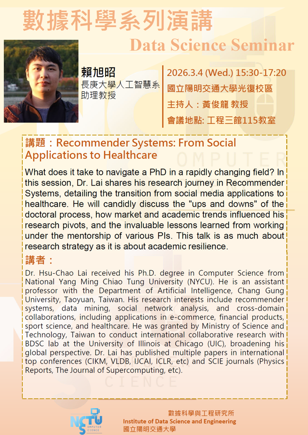【數據科學系列演講】2026.3.5(三)15:30-17:20。講者:賴旭昭,長庚大學人工智慧系 助理教授。講題:Recommender Systems: From Social Applications to Healthcare Published on 2026-02-26 15:39 Author 張怡婷 Tweet